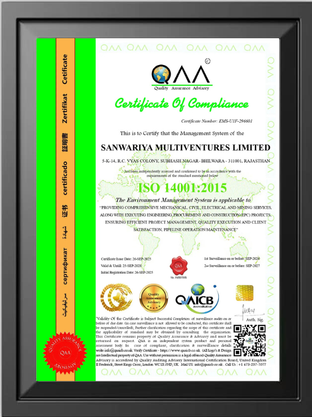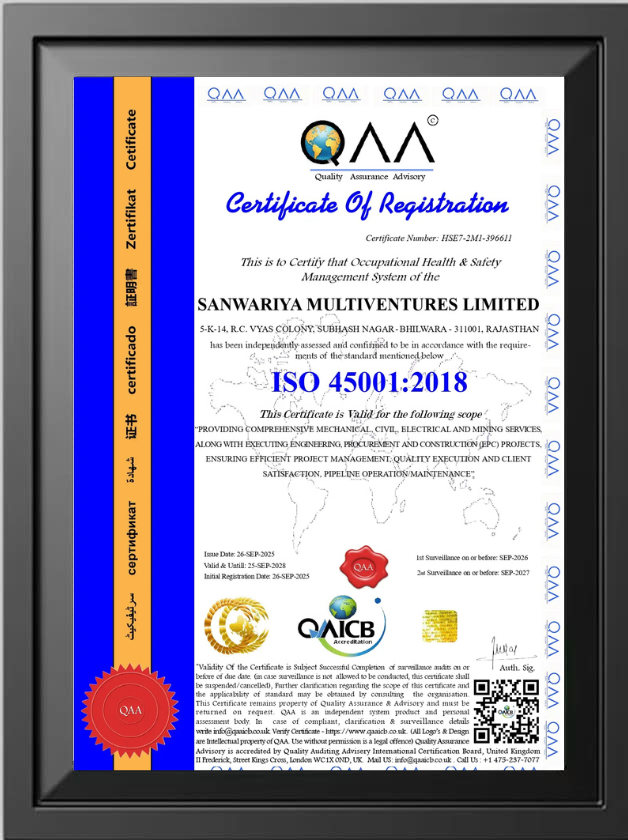 Sanwariya Multiventures holds key certifications that reflect our commitment to quality, safety, and industry standards. These certifications highlight our adherence to best practices, ensuring reliable and professional services for every project we undertake.